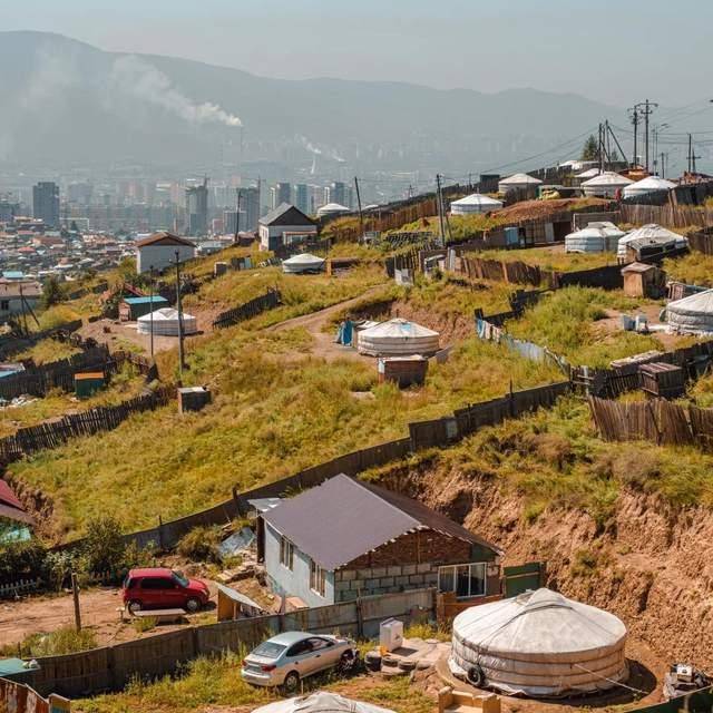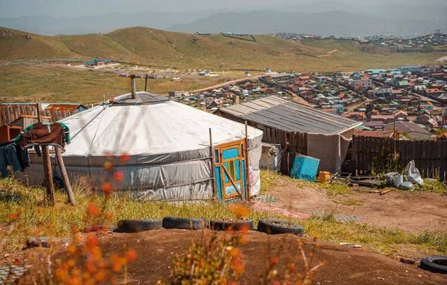 这个国家曾横扫欧亚大陆,如今却在自己的土地上挣扎。乌兰巴托机场像是从九十年代中国县城搬来的,水泥墙剥落,玻璃脏得看不清外面。刚下飞机,我就听见广播用蒙语和俄语播报,唯独没有英语。等我拖着行李走出航站楼,迎面是一排排低矮的板房和零星散落的蒙古包,在城市边缘连成一片灰蒙蒙的棚户区。 司机说,这些都是从牧区进城的牧民。这几年草场退化,牛羊卖不上价,他们只能来首都讨生活。可城里也没活干,大多数人就靠打零工、捡废品过日子。白天看不见人,晚上才陆陆续续点起煤炉做饭。