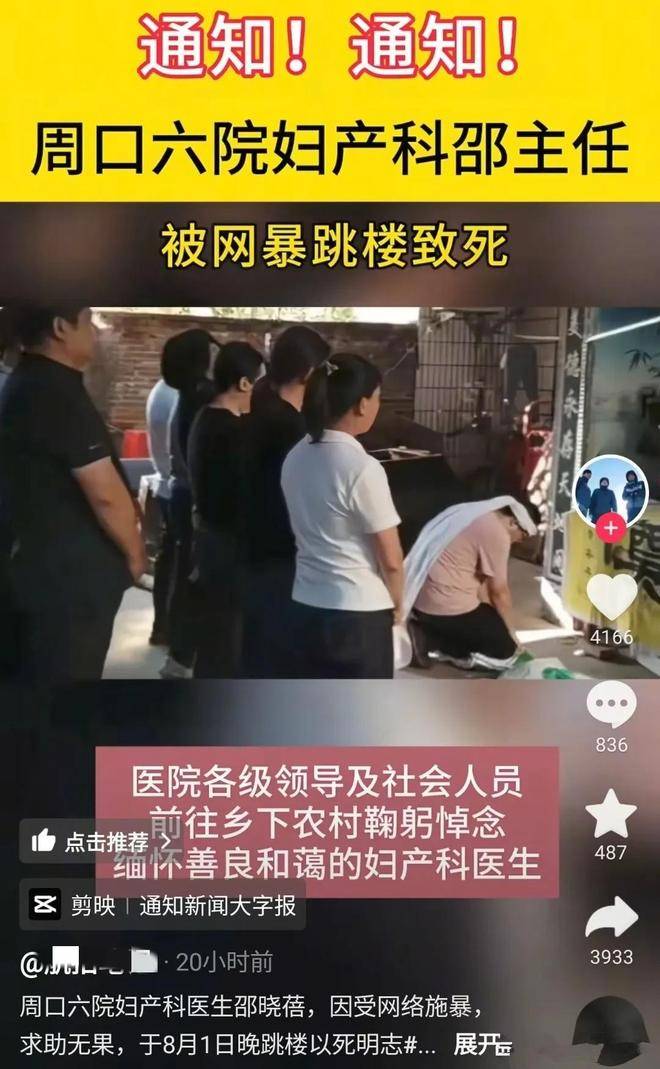 | 网络世界的喧嚣从未停歇,而当虚拟空间的恶意具象化为现实中的悲剧,总让人难以平静。近日,周口市第六人民医院妇产科主任邵晓蓓因长期遭受网络暴力选择跳楼自杀,这起事件如一块巨石投入舆论湖面,激起层层涟漪。8月4日,邵医生的遗体已在老家下葬,而围绕她的争议与叹息,仍在持续发酵。 据8月5日的媒体报道称,一切的起点,是三起医疗纠纷。起初,前两位患者家属发布的视频并未引发太多关注,直到这三起纠纷的家属在抖音上相遇,彼此关注、互相推荐作品,才像推倒了多米诺骨牌,引来了大批网络水军对邵医生的集中攻击。恶评如潮水般涌来,最终将这位从医多年的妇产科医生推向了绝望边缘。 7月30日,不堪其扰的邵医生曾独自前往周口市太昊路派出所报警,却被告知未予立案。据其丈夫张先生回忆,那天邵医生与警察闹得不愉快,回家后他还在电话里反复劝慰。可劝慰终究抵不过持续的恶意,7月31日,周口六院的工作人员陪同邵医生再次报警,张先生也特意请假陪同前往。这一次,警方立了案,却未明确解决办法,也没有第一时间联系网暴者下架视频。张先生当时就跟警察强调,“不要不当回事,因为网暴想不开自杀的案例有很多”,只是这句提醒,最终没能拦住悲剧的发生。 8月1日,邵医生在抖音发布了一条告别视频,又与孙子孙女视频通话,给张先生留下一封遗书后,选择了跳楼。遗书中,她详细写下了三起医疗纠纷的来龙去脉,最后叮嘱丈夫一定要替自己正名。“她是太绝望了,没人能帮她。”张先生的话语里,满是无力。事发后,派出所取走了邵医生的手机,下架了她的告别视频和网暴者账号内的全部内容。8月2日,公安局、卫健委及周口六院召开会议,公安局成立三个专班,针对三个涉事账号展开调查。