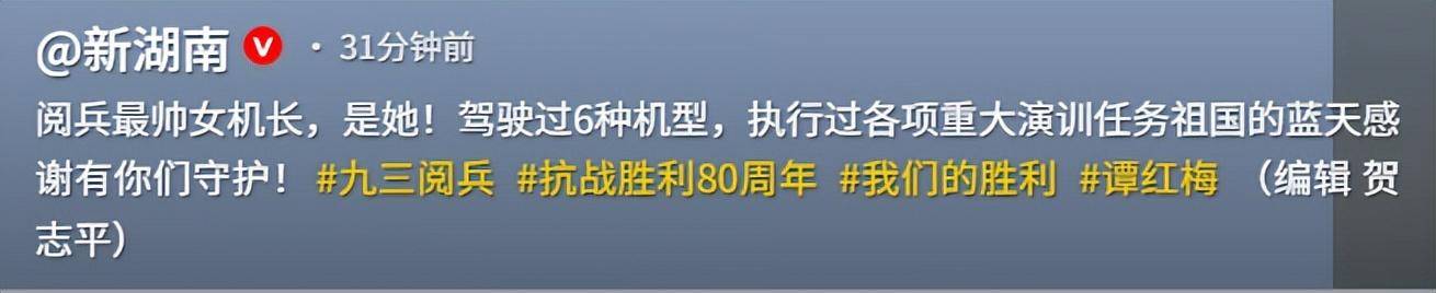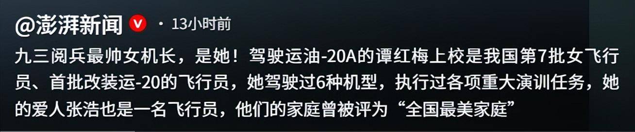 谭红梅的事迹被央视新闻等媒体报道后,她一下子受到了广大网友的关注和点赞,网友们都纷纷称赞她,说她“好帅”“巾帼不让须眉”。 很多人可能不明白,为什么一架加油机这么重要,还要在阅兵式上特意展示?