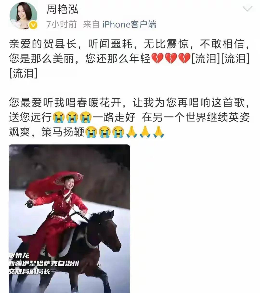 图片来源于网络 贺娇龙最后一条朋友圈是1月6号发的:“不是所有的坚持都能抵御岁月,但若为热爱,便所向披靡。”没人想到这话成了告别。1月1号她还说:“天上不会掉馅饼,努力奋斗才会梦想成真。” 歌手周艳泓发文说:“亲爱的贺县长,听闻噩耗无比震惊……我为您在唱响这首歌《春暖花开》,送您远行。”她妈妈再也等不到女儿回家吃饭了。